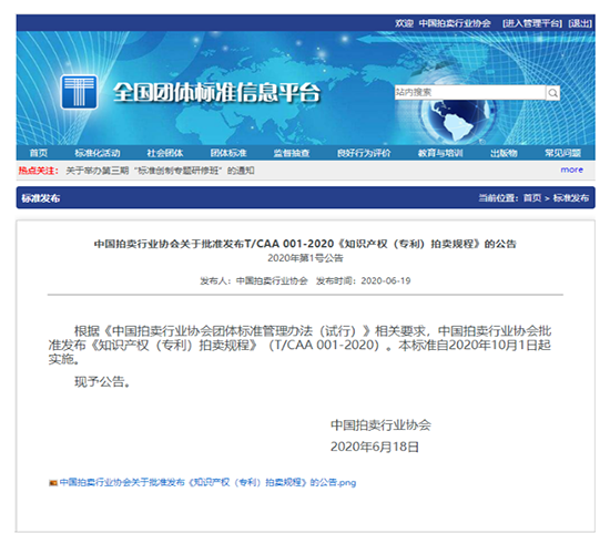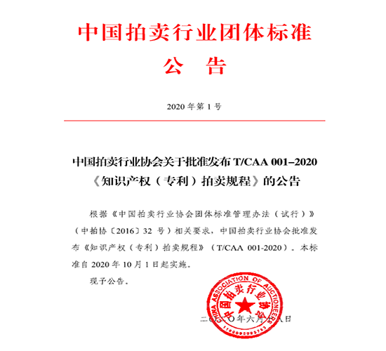 協(xié)會(huì)通知 | 中國拍賣行業(yè)協(xié)會(huì)關(guān)于批準(zhǔn)發(fā)布T/CAA 001-2020《知識(shí)產(chǎn)權(quán)(專利)拍賣規(guī)程》的公告