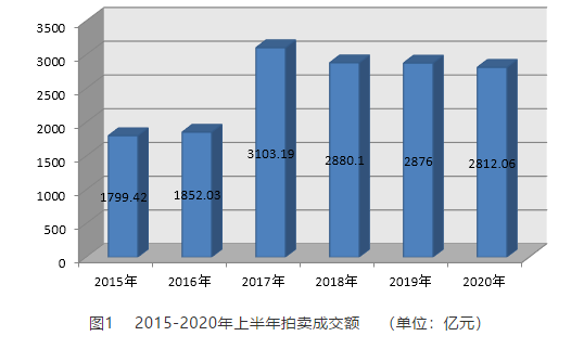 據(jù)商務(wù)部“全國拍賣統(tǒng)一業(yè)務(wù)平臺”統(tǒng)計,上半年1-6月份,拍賣總成交額2812.06億元,同比下降2.22%(見圖1)。上半年,主要受到疫情的影響,全國各地拍賣活動不同程度出現(xiàn)業(yè)務(wù)延遲或取消。其中,一季度,成交額879.86億元,同比下降22.86%,環(huán)比上年四季度降幅66.6%;二季度得益于疫情有效控制和企業(yè)復(fù)工復(fù)拍節(jié)奏加快,成交額出現(xiàn)補(bǔ)漲,共成交1932.19億元,同比增長 11.34%,環(huán)比第一季度增幅高達(dá) 119.6%。