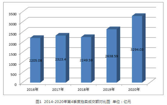 據(jù)商務(wù)部“全國(guó)拍賣(mài)業(yè)務(wù)統(tǒng)一平臺(tái)”數(shù)據(jù)統(tǒng)計(jì),第4季度得益于疫情有效控制和企業(yè)全面復(fù)工復(fù)拍,成交額出現(xiàn)大幅補(bǔ)漲,拍賣(mài)行業(yè)總成交額達(dá)到3294.03億元,較去年同期(2638.95億元)增長(zhǎng) 24.82%(見(jiàn)圖1)。