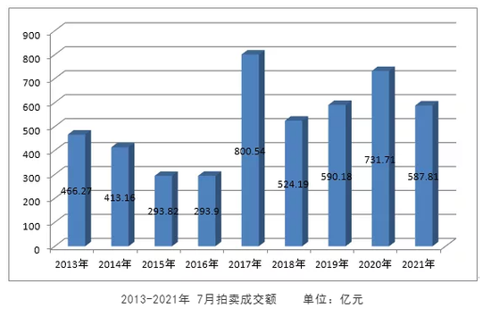 據(jù)“商務(wù)部業(yè)務(wù)系統(tǒng)統(tǒng)一平臺”統(tǒng)計(jì),7月份全國拍賣企業(yè)拍賣成交場次8494場,較去年同期減少了482場,實(shí)現(xiàn)成交額587.81億元,同比下降19.67%(見圖)。
