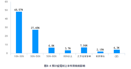 調(diào)研還顯示,48.57%的企業(yè)預(yù)計(jì)疫情對(duì)上半年?duì)I收的影響(占去年同期比重)為10%-30%;27.45%的企業(yè)預(yù)計(jì)有30%-50%的影響;6.8%的企業(yè)認(rèn)為在50%-80%之間;3.7%的企業(yè)認(rèn)為影響超過(guò)80%。四項(xiàng)合計(jì),受到負(fù)面影響的企業(yè)達(dá)86.52%。同時(shí),值得注意的是,從問(wèn)卷抽樣看,同一企業(yè)經(jīng)營(yíng)者對(duì)上半年?duì)I收下降比例的判斷普遍大于1季度,說(shuō)明企業(yè)經(jīng)營(yíng)者對(duì)疫情過(guò)后的業(yè)務(wù)恢復(fù)并不樂(lè)觀。