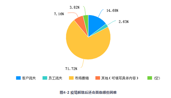 針對(duì)疫情解除后的困難,企業(yè)經(jīng)營(yíng)者最擔(dān)心的是拍賣(mài)市場(chǎng)萎縮(占比71.72%)、客戶流失(占比14.68%)。