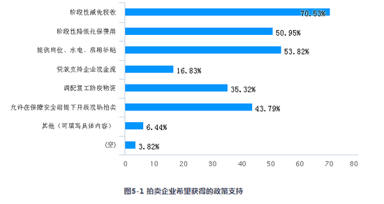 調(diào)研顯示,針對(duì)疫情帶來(lái)的困難,企業(yè)最迫切希望獲得的政策支持是階段性減免稅收(70.53%)、提供崗位、水電、房租補(bǔ)貼(53.82%)、階段性降低社保費(fèi)用(50.95%),以及允許在保障安全前提下開(kāi)展現(xiàn)場(chǎng)拍賣(mài)(43.79%)。