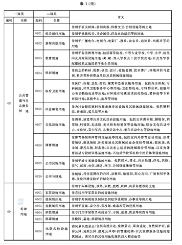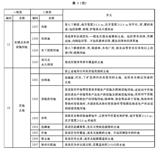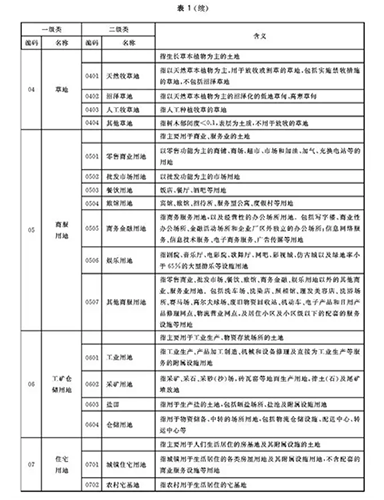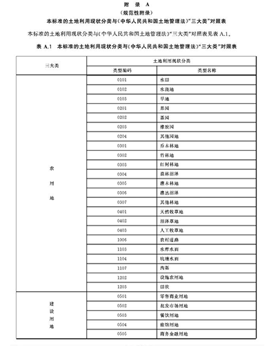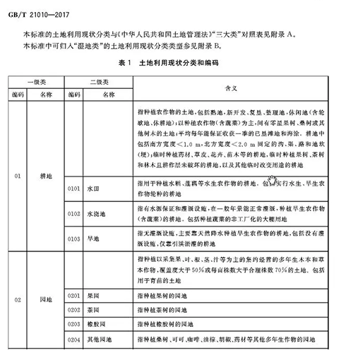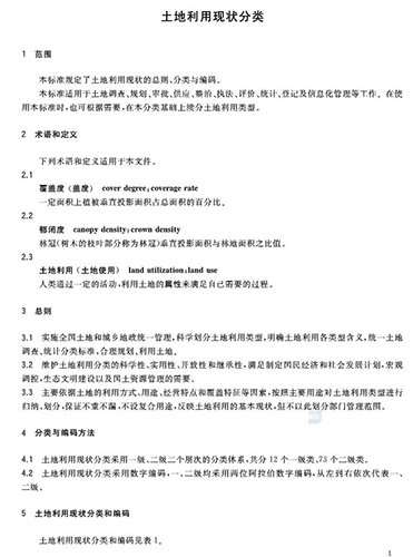 《土地利用現(xiàn)狀分類》國家標(biāo)準(zhǔn)采用一級(jí)、二級(jí)兩個(gè)層次的分類體系,共分12個(gè)一級(jí)類、57個(gè)二級(jí)類。其中一級(jí)類包括:耕地、園地、林地、草地、商服用地、工礦倉儲(chǔ)用地、住宅用地、公共管理與公共服務(wù)用地、特殊用地、交通運(yùn)輸用地、水域及水利設(shè)施用地、其他土地。