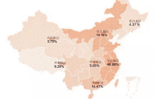 2019年,華東地區(qū)機(jī)動(dòng)車拍賣日趨活躍,全年成交量12.05萬(wàn)臺(tái),成交額56.6億元,幾乎占據(jù)全國(guó)機(jī)動(dòng)車拍賣市場(chǎng)的半壁江山。